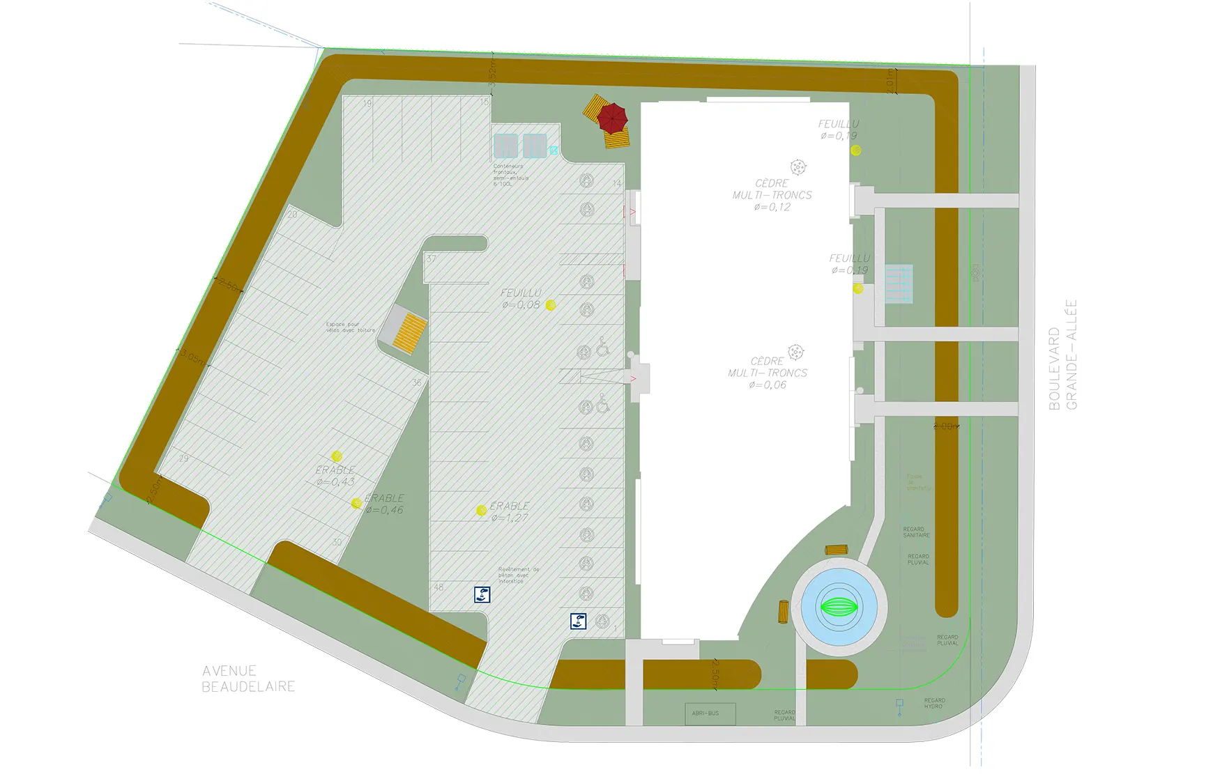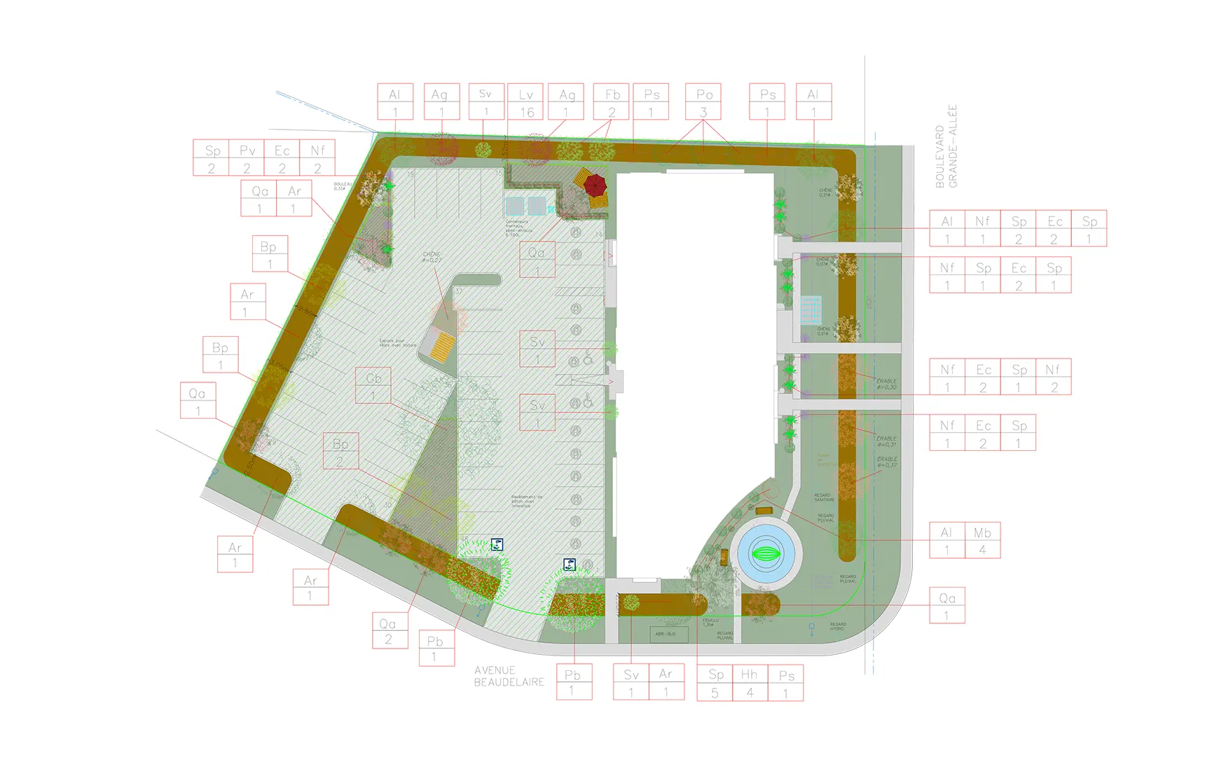 - Nous utiliserons des pavés ainsi que du béton pour l’ensemble du stationnement afin d’éviter la réflexion de la chaleur.